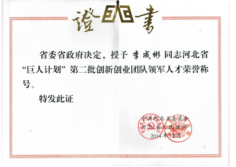光源太阳能董事长李成彬,被授予河北省“巨人计划”第二批创新创业团队领军人才荣誉证书