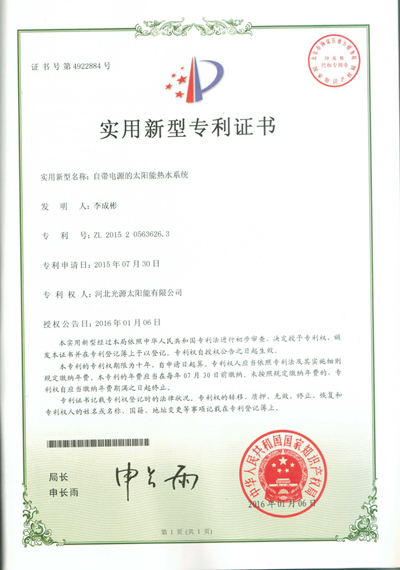 实用新型专利证书--自带电源的太阳能热水系统