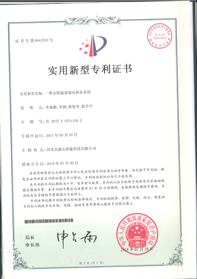 实用新型专利证书--一种太阳能采暖及热水系统(1)