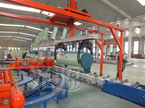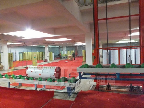 该生产线水箱发泡采用卧式无氟高压定量一次发泡工艺,是国内第一家,也是目前国内最先进的发泡线;内外桶组装完成后由机械手自动抓取,放到工艺小车上,发泡完成后也由机械手来完成水箱的下件工作,减轻了工人的劳动强度,减少了搬运过程中的磕碰等现象;发泡完成后水箱由锥滚线和升降机自动运送到地下室,属首家采用地下室恒温保温工艺,节约能源,保证生产出的水箱具有稳定的质量。
