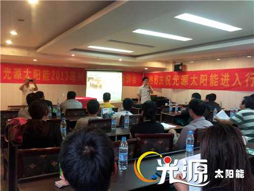 9月12日,光源太阳能安徽亳州招商会成功举行。会场摆放了光源样机,整洁美观的外形,结实耐用的支架及合理的产品设计,得到与会经销商的赞扬。
