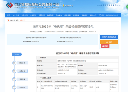 7月23日我公司(河北光源太阳能科技有限公司)在南宫市2019年“电代煤”采暖设备招标项目的竞标中,凭借过硬的产品质量,扎实高效的工作作风,卓越的运作团队和良好的企业信誉,以绝对的优势顺利中标。