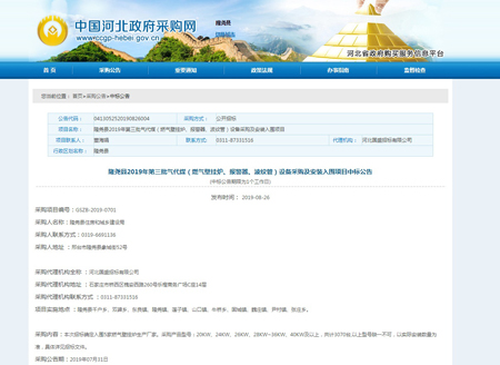 光源公司中标隆尧县2019年第三批气代煤(燃气壁挂炉、报警器、波纹管)设备采购及安装入围项目