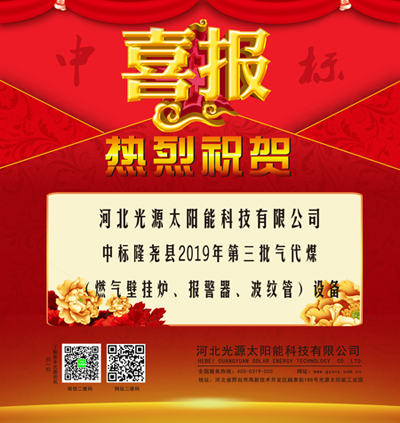 捷报频传, 热烈祝贺我公司(河北光源太阳能科技有限公司)2019年08月22日中标隆尧县2019年第三批气代煤(燃气壁挂炉、报警器、波纹管)设备采购及安装入围项目。本次中标又一次认可了我公司的产品质量,验证了我公司的实力。
