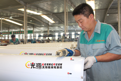 河北光源太阳能科技有限公司员工在制桶生产线上加班加点赶制太阳能采暖水箱。