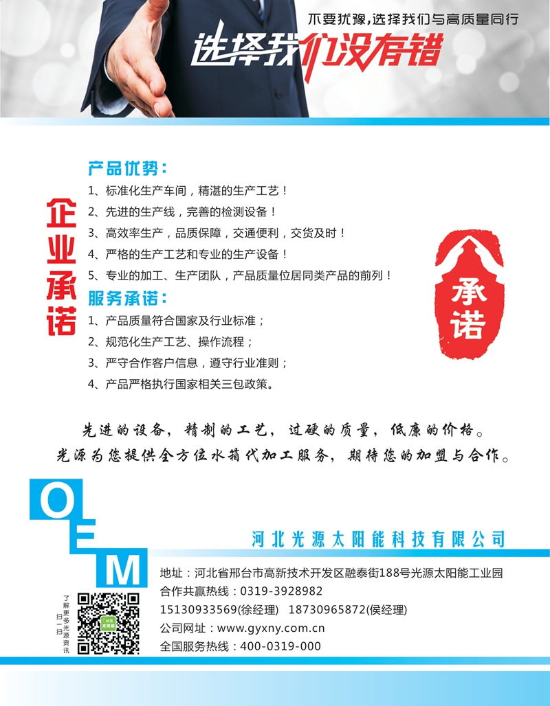 河北光源太阳能科技有限公司是一家集太阳能光热产品研发、生产、销售为一体的专业化骨干企业。公司地址位于河北省邢台经济开发区,总占地150亩,建筑面积5.2万平方米,现有员工420人。主导产品:一是太阳能真空集热管;二是家用型太阳能热水器;三是集中式中高温太阳能工程的设计、生产与施工。企业规模为河北省太阳能热利用行业榜首,国内业界名列前茅。