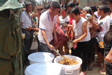 饮食制作小组除了保障本公司员工就餐外,还要做好灾民饮食保障工作。送饭小组除了完成送饭任务外,还要帮助饮事小组工作,确保既不误灾民吃饭,又不误员工用餐。